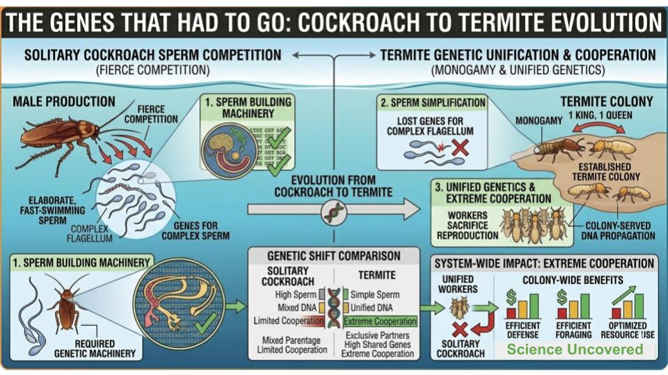 The first involves sperm competition. Solitary cockroaches produce elaborate, fast-swimming sperm that compete with those of rival males for fertilization. The genetic machinery needed to build these structures is complex. Termites lost those genes.