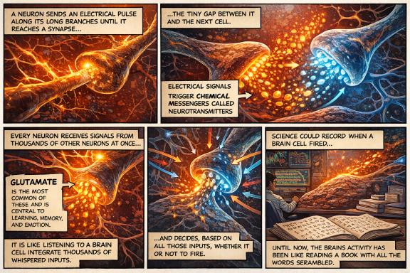 Scientists have long been able to record when a neuron fires. What they could not do was see which incoming signals caused it to fire. Those inputs were too faint and too fast to detect in living tissue. The result was that neuroscience has been reading the brain’s activity like a book with all the words in the wrong order, able to see the individual letters but not the sentences they form.