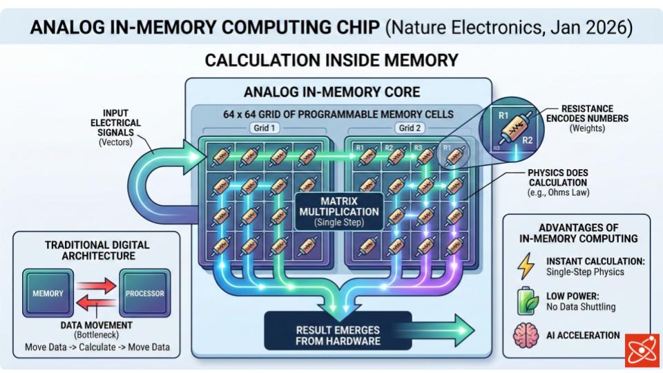 The chip uses two 64-by-64 grids of programmable memory cells whose electrical resistance values encode the numbers being processed. When an electrical signal passes through the grid, the physics of the circuit performs matrix multiplication in a single step, with no data sent to an external processor. The result emerges directly from the hardware.